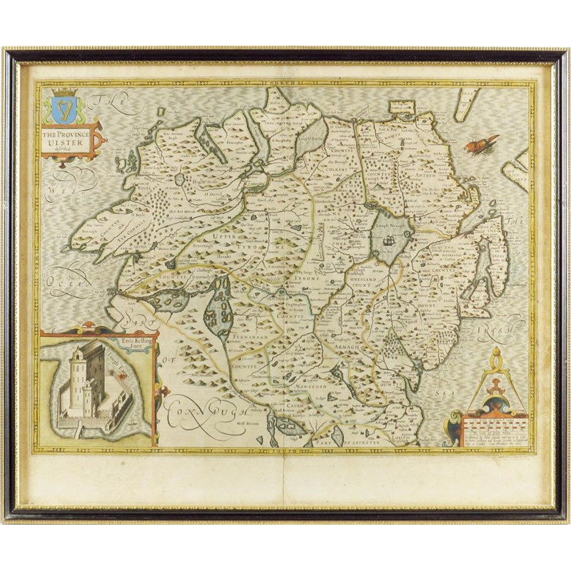 John Speed (1552-1629). 'THE PROVINCE ULSTER', a hand-coloured engraved map with a view of Enis Kelling Fort, dated 1610, the verso with text, 38 x 51cm, in a later glazed, double sided Hogarth style frame.