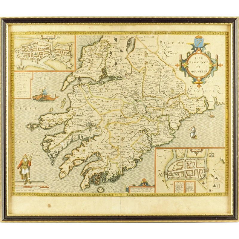 John Speed (1552-1629). 'THE PROVINCE OF MOUNSTER', a hand-coloured engraved map with plans of 'LYMERICKE' and 'CORCKE', dated 1610, the verso with text, 39 x 51.5cm, in a later glazed, double sided Hogarth style frame.