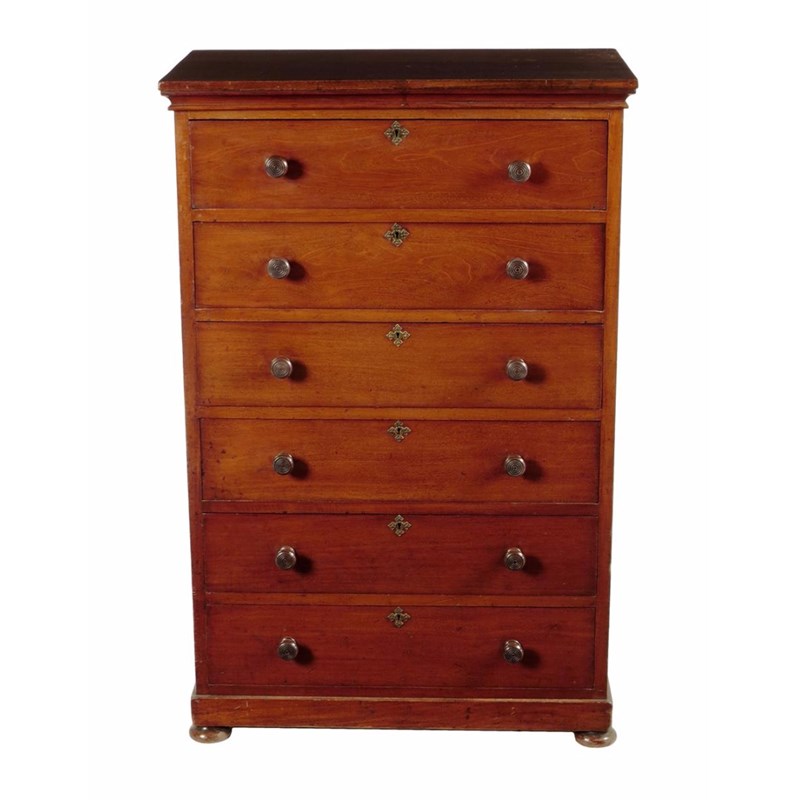 A late Victorian mahogany chest, of six graduated drawers, with turned wood handles on disc feet, 104.6cm high, 68.5cm wide, 39.3cm deep.