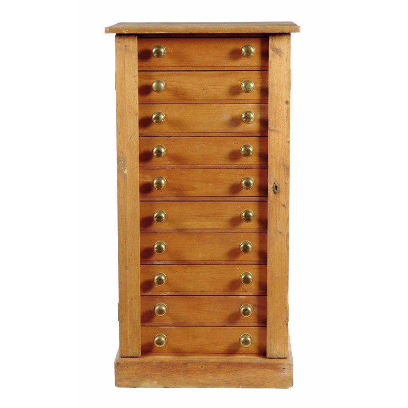 A Victorian pine Wellington chest, of ten drawers with brass knob handles with two pilasters, one locking, 98.1cm high, 50.6cm wide, 45.2cm deep.