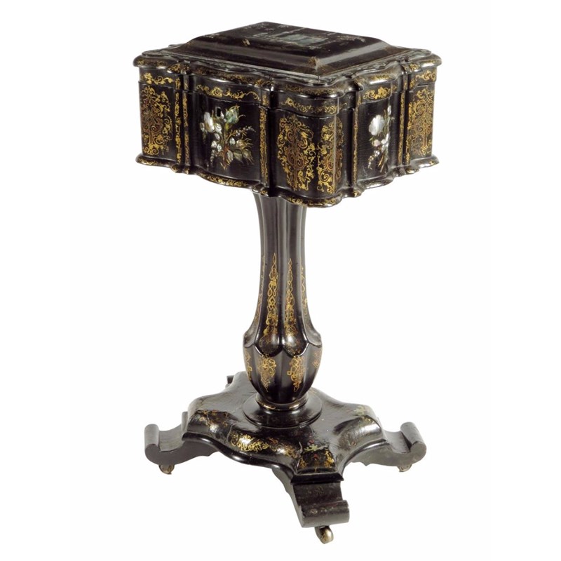 A Victorian papier-mâché teapoy, inlaid with mother of pearl and decorated with gilt highlights, the hinged lid with a mosque revealing a vacant interior, on brass castors, 81.5cm high, 45.8cm wide, 35cm deep.