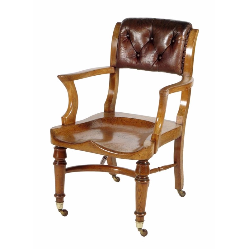 A Victorian elm desk chair, with a leather button upholstered back and a solid seat, on turned front legs united by a crinoline stretcher.