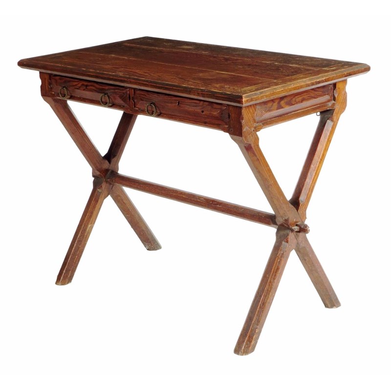 A Victorian pitch pine Gothic revival side table, the boarded top above twin frieze drawers with rope twist brass ring handles, on chamfered 'X' shape supports united by a stretcher, 74cm high, 91.3cm wide, 55.3cm deep.
