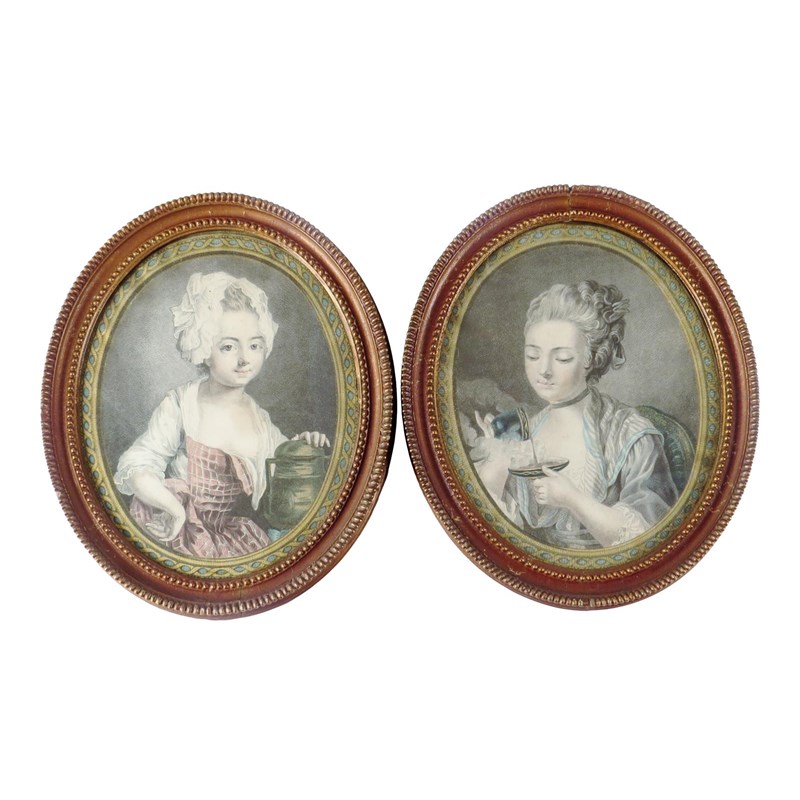 A pair of early 19th century French coloured engravings of ladies in the manner of Greuze, each in a beaded and moulded glazed frame, 33 x 27.2cm. (2)