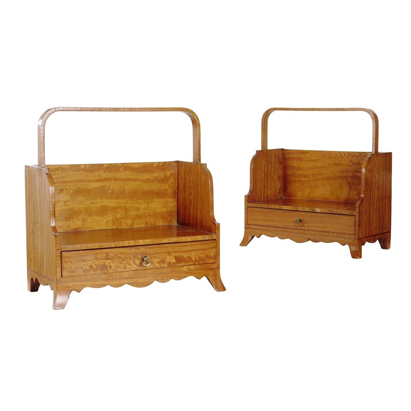 A pair late Victorian satinwood book carriers, each with a handle and a drawer on swept bracket feet, 35.7cm high, 34.2cm wide. (2)