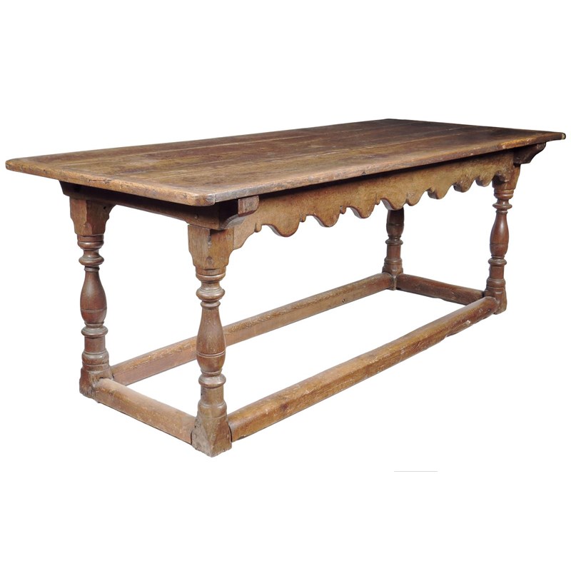 An early 18th century and later oak refectory table, the boarded top with cleated ends above a wavy edge frieze on baluster turned supports united by peripheral stretchers, 79.5cm high, 87cm wide, 214cm long.
