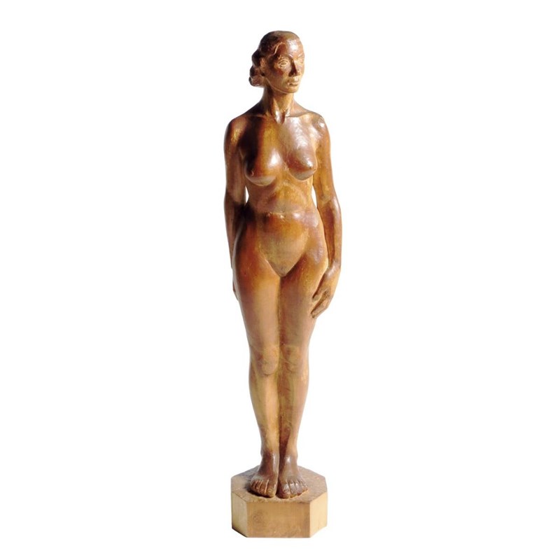 ‡ Mary Syme Boyd (Scottish 1910-1997). A carved wood figure of a nude lady, standing on an octagonal plinth, signed with initials 'MSB', the underside with a trade card inscribed 'MARY SYME BOYD, HOUSE & STUDIO, 14 BELFORD MEWS, EDINBURGH, 4, SCULPTURE, WOOD CARVER, HAND WROUGHT SILVER', 93.7cm high.