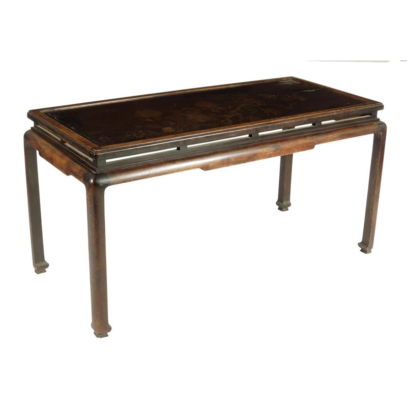 A Chinese hardwood side table, the rectangular top inset with a brown lacquer panel decorated in gilt with chrysanthemums and other flowers above a pierce frieze, 67cm high, 131.5cm wide, 61.5cm deep.