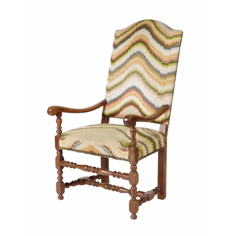 An 18th century walnut open armchair, the arched padded back and seat covered in Bargello style fabric, with turned baluster and block legs united by stretchers.
