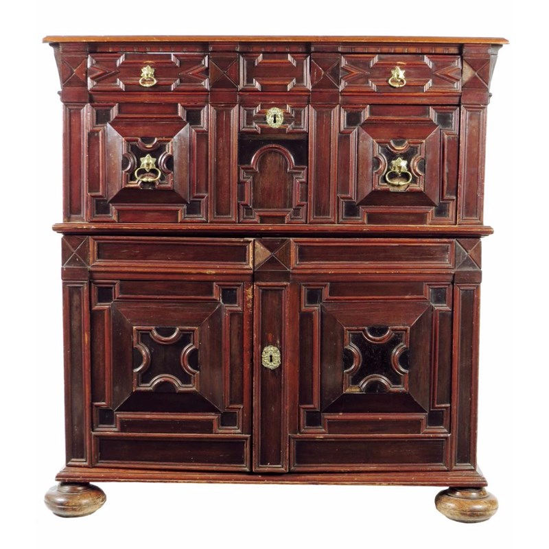 A Charles II cedar and walnut enclosed chest, in two halves, with a shallow and deep drawer, above a pair of hinged doors enclosing three oak drawers, with geometric panelled fronts with some ebony veneers on flattened bun feet, with panelled sides, 123.7cm high, 119cm wide, 63cm deep.