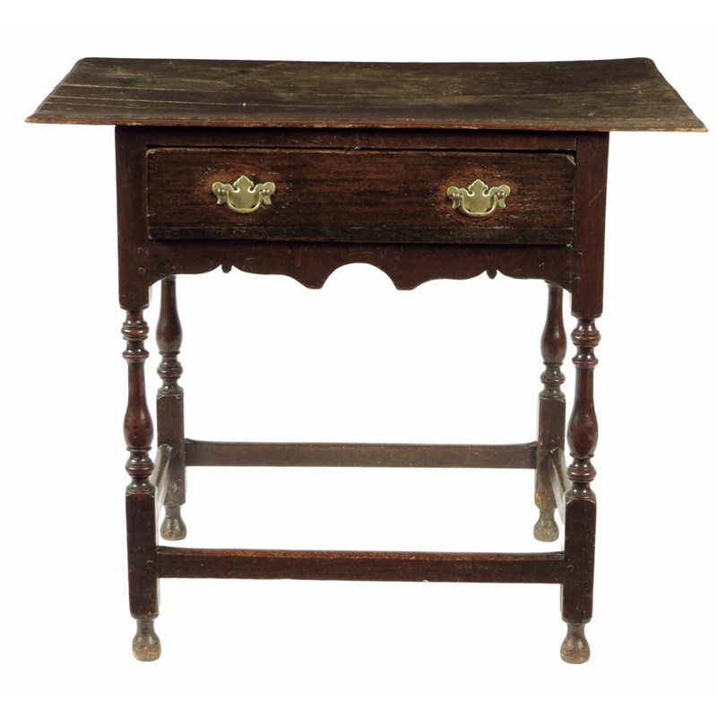A Queen Anne oak side table, the boarded top above a frieze drawer and a wavy edge apron on baluster and block legs united by peripheral stretchers, 71.7cm high, 82.5cm wide, 53.2cm deep.