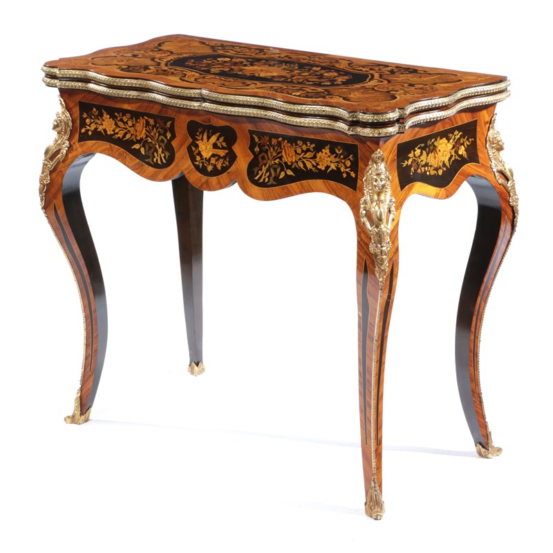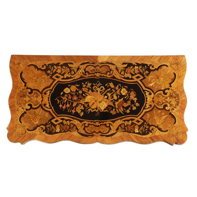 with ormolu mounts, the top inlaid with musical instruments, birds, urns, leaves and flowers in various fruitwoods, the swivel fold-over top revealing a baize lined and marquetry banded interior, the frieze with conforming panels, on cabriole legs