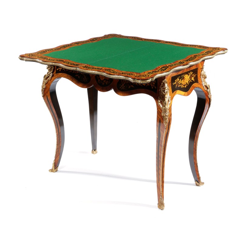 A FRENCH KINGWOOD AND MARQUETRY SERPENTINE CARD TABLE IN LOUIS XV STYLE