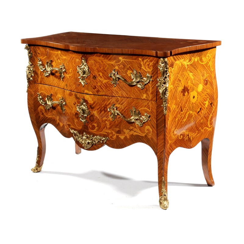 A FRENCH KINGWOOD AND MARQUTRY BOMBE COMMODE IN LOUIS XV STYLE