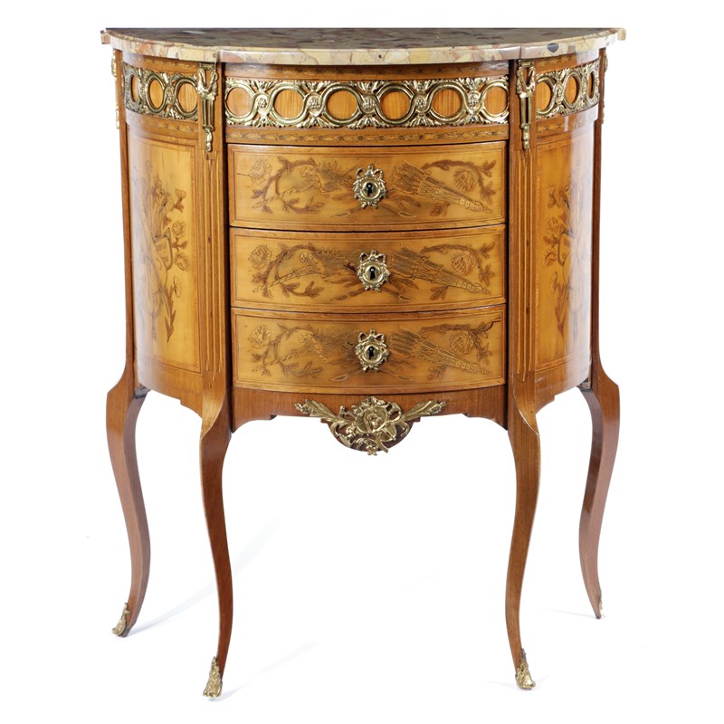 A FRENCH KINGWOOD AND MARQUETRY DEMI-LUNE COMMODE
