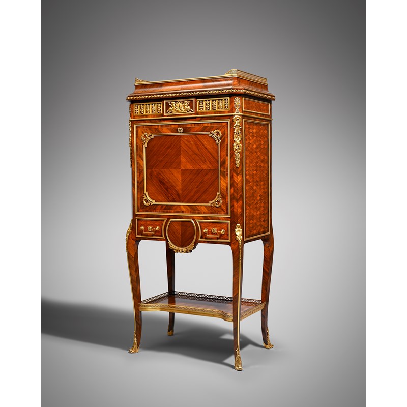 with ormolu mounts of satyrs, laurel leaves and urns of flowers, with parquetry lattice panels, the top with a pierced gallery above a frieze drawer, the hinged fall revealing a leather and plush lined writing surface, above a further drawer, on cabriole legs united by an undertier