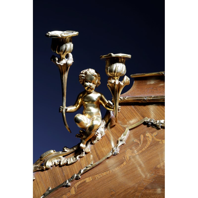 with ormolu mounts, of bombe shape, applied with a pair of cherub candle holders, the hinged fall inset with a gilt tooled leather writing surface, with a pair of drawers and pigeonholes, above three frieze drawers, on cabriole legs