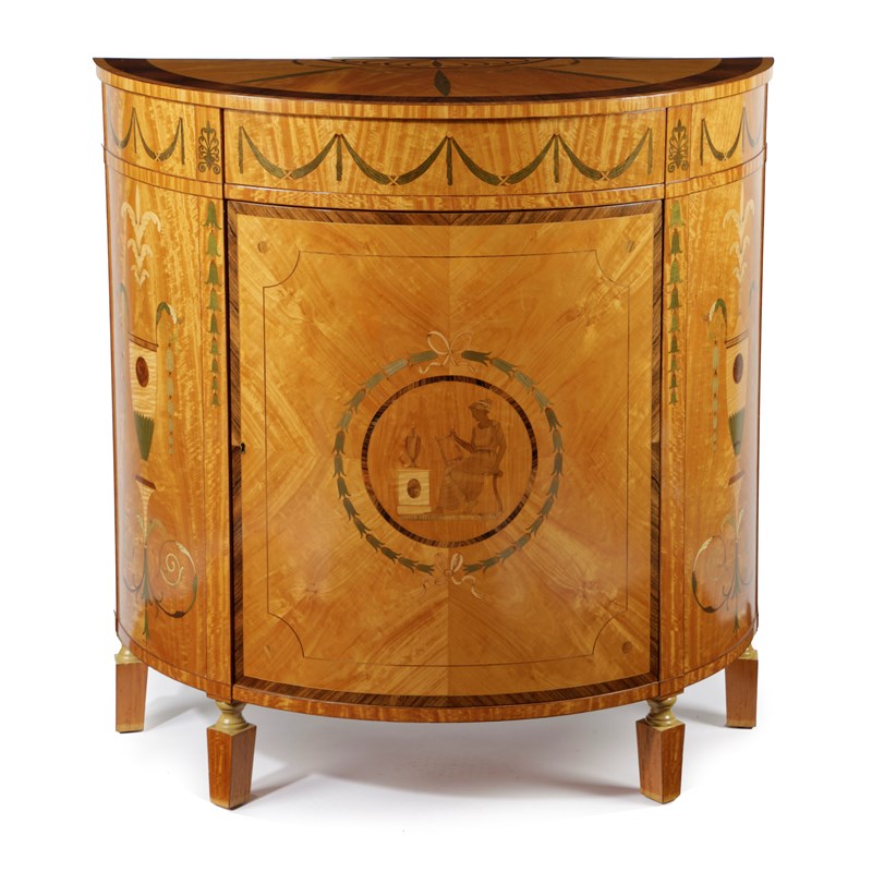Λ A SATINWOOD AND MARQUETRY DEMI-LUNE COMMODE IN GEORGE III STYLE