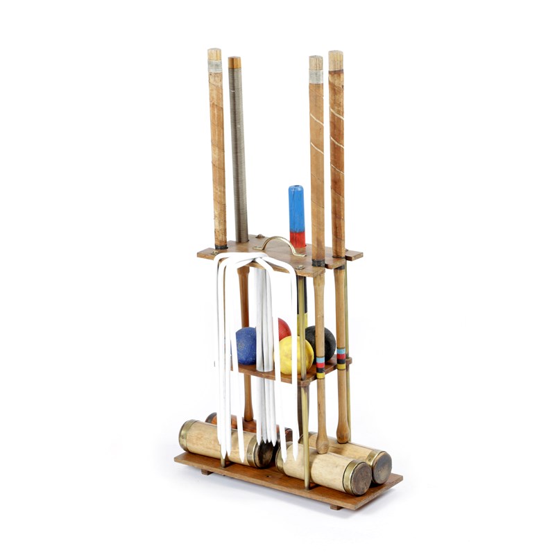 with four mallets, three by Spalding and an associated one by Jaques, with hoops, balls and marker posts, the stand with a brass handle and pole supports