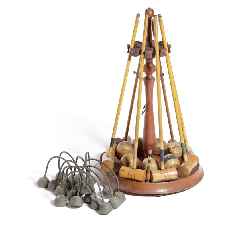 with a mahogany stand supporting mallets, balls, a marker post and hoops, in a pine open box