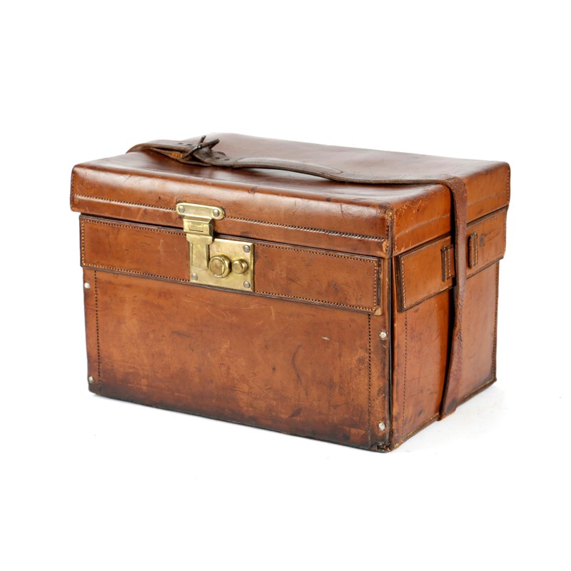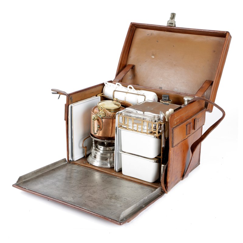 with a hinged lid and front containing four enamel plates, a copper kettle and burner, four Royal Worcester china tea cups and saucers, glass jars and bottles, a wicker covered flask, sandwich cases and cutlery, marked 'Drew & Sons 'En Route' Piccadilly Circus W. London'