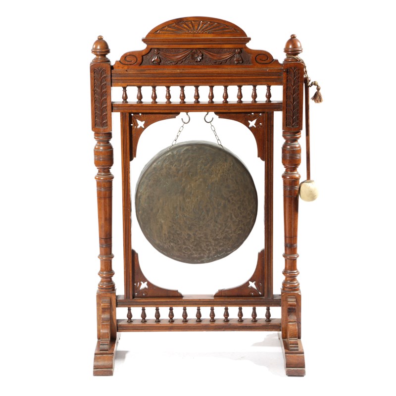 the frame carved with swags, leaves and with a spindle gallery, with a bronze gong and a beater