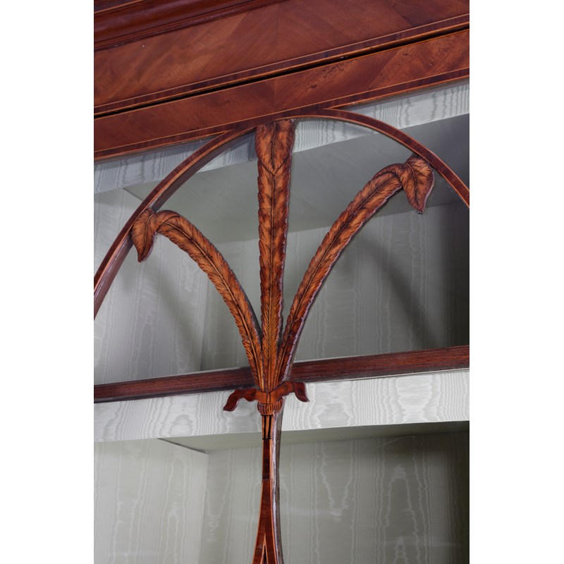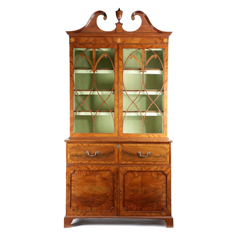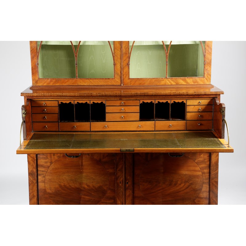 inlaid with boxwood stringing, the detachable cornice with a broken swan neck pediment and a central turned mahogany urn, above a banded frieze inlaid with three paterae, above a pair of astragal glazed doors decorated with penwork Prince of Wales plumes of feathers, enclosing a later silk lined interior with adjustable shelves, the crossbanded fall with later brass handles, the satinwood interior with drawers and pigeonholes with chequered stringing, the base with a pair of rectangular doors with circular panels, enclosing two short and one long drawer on bracket feet