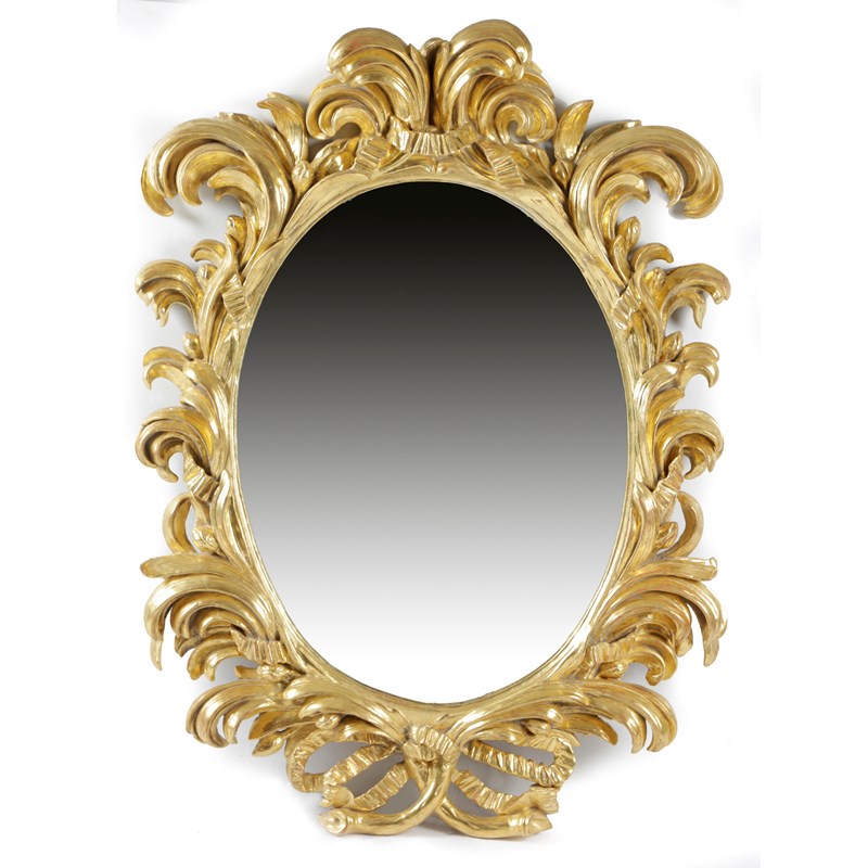 with a bevelled oval plate within a ribbon tied palm frond carved frame