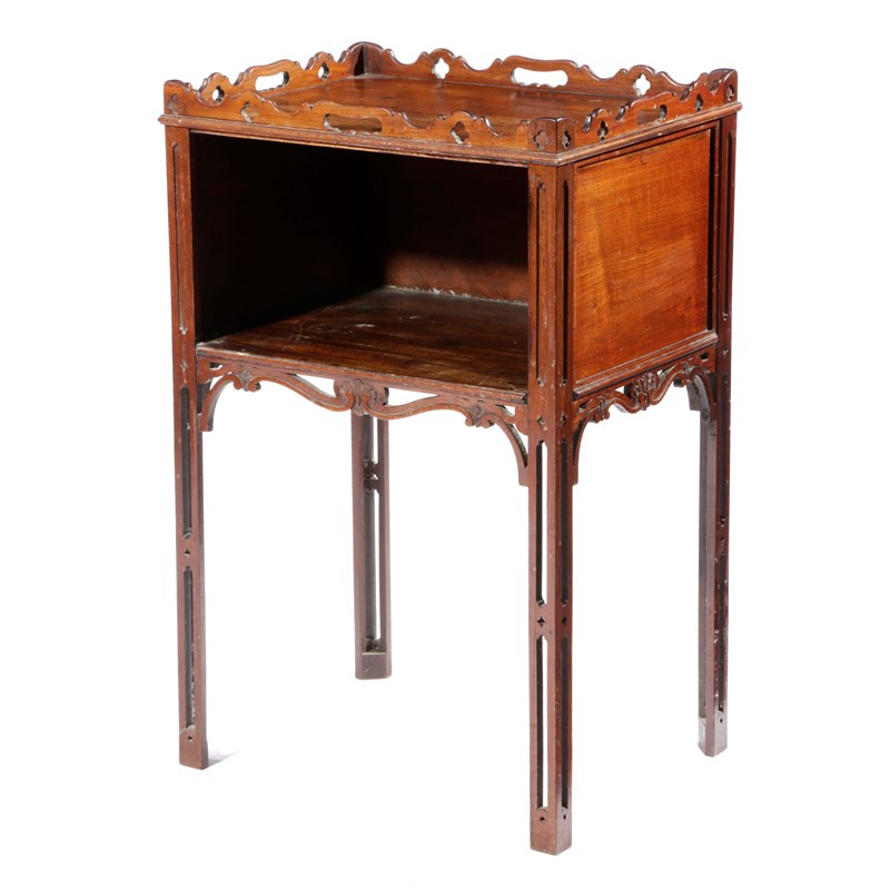 A MAHOGANY TRAY-TOP BEDSIDE CUPBOARD IN CHINESE CHIPPENDALE STYLE