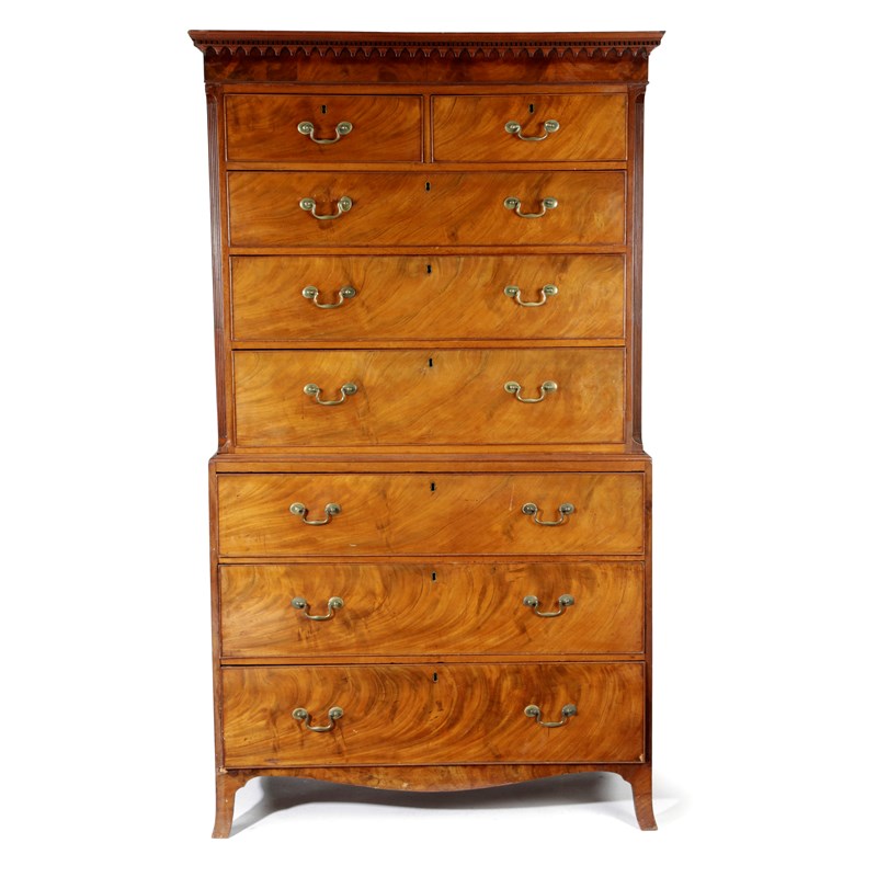 the dentil and pendant frieze above two short and three long graduated drawers, flanked by stop fluted canted corners, the base with three long drawers, on French bracket feet