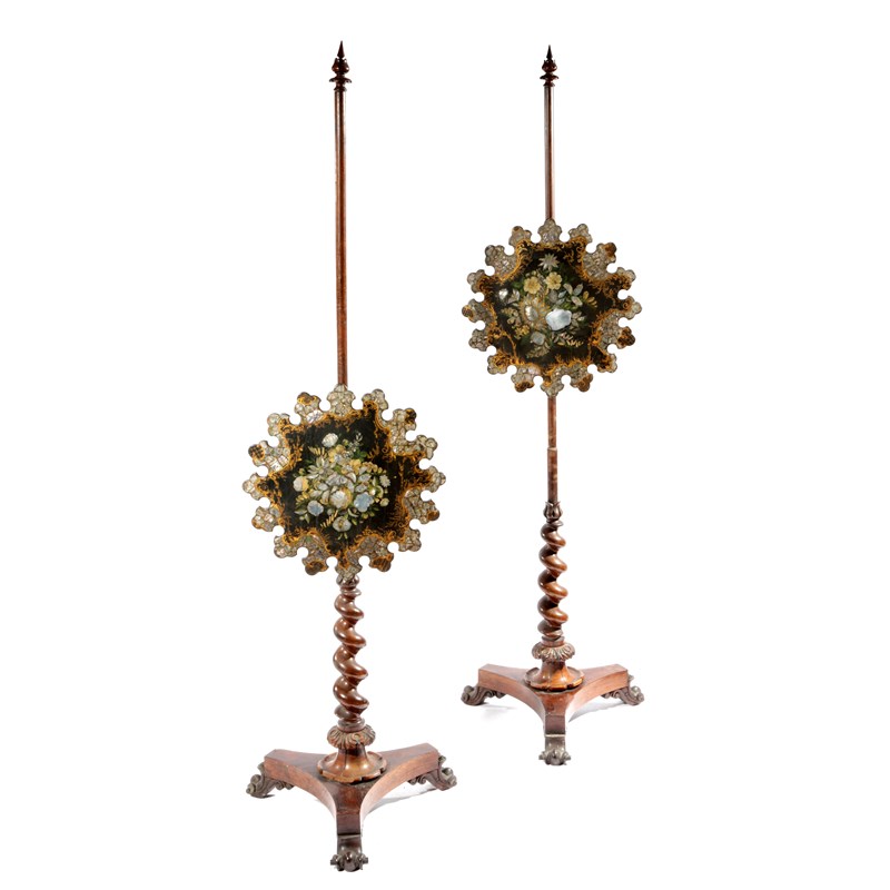 Λ A PAIR OF VICTORIAN ROSEWOOD AND PAPIER-MACHE POLE FIRE SCREENS