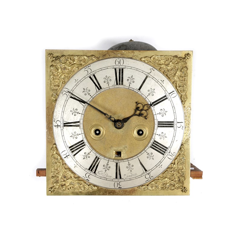 the eight day movement with four turned and finned pillars, with an anchor escapement striking on a bell, the 11in dial with a silvered chapter ring with Roman and Arabic numerals, with date aperture, signed 'Nat Pine London', with boy and crown spandrels, with winding key, no weights