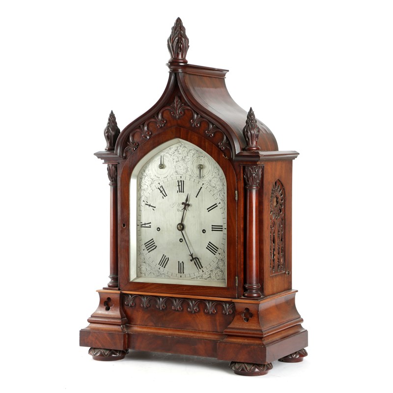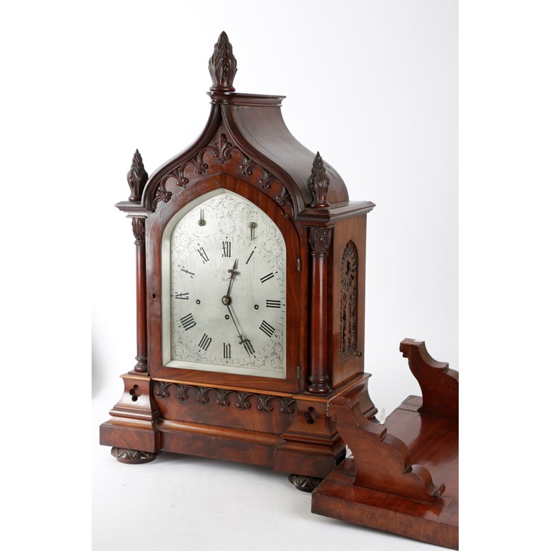 the brass three train movement with four turned pillars and an anchor escapement striking on eight bells and a gong, the arched silvered dial with Roman numerals and slow / fast and chime / silent dials, engraved with scrolling leaves, with blued steel fleur-de-lis hands and signed 'G. Wadham Bath', the Gothic revival case with carved leaf finials, turned columns and decorated with quatrefoils, on carved flattened bun feet, with a mahogany bracket (2)