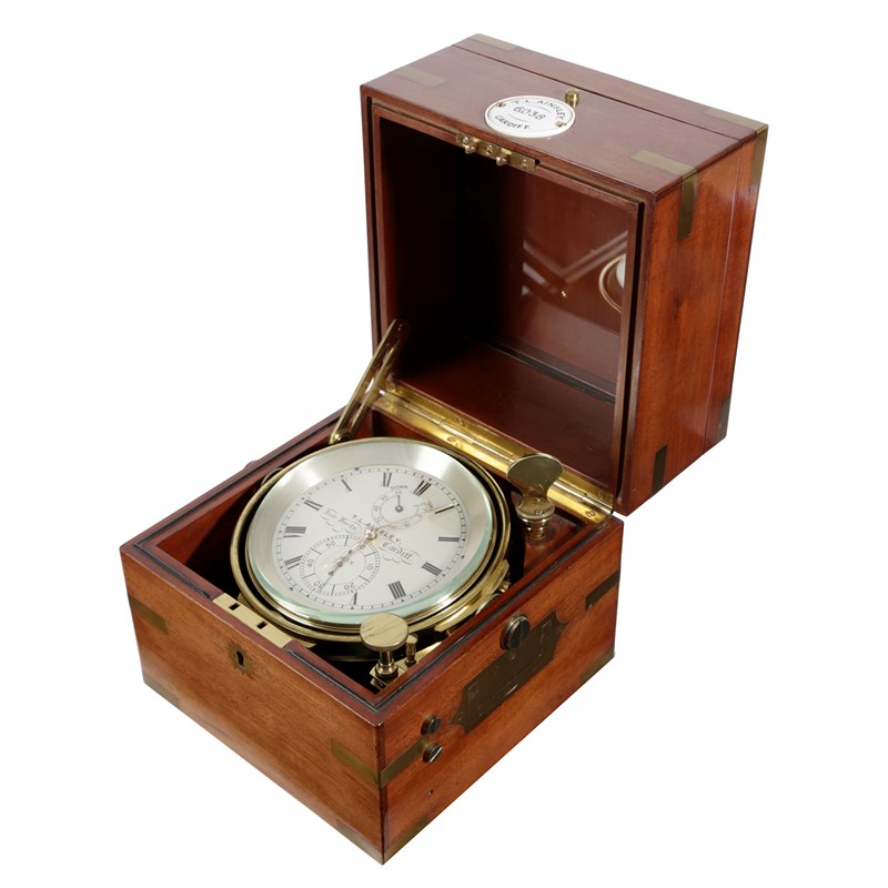 the brass fusee movement with a split bi-metallic balance to the Earnshaw type escapement, with machine decoration to the backplate, numbered '6038', the circular four and a quarter inch silvered dial with Roman numerals, subsidiary seconds and fifty-six hour Down / Up dials, inscribed 'T. L. Ainsley, Bute Docks, Cardiff' with spade hands, the brass bound twin hinged case with a glazed upper section with side carrying handles, with an ivory maker's plaque, numbered '6038'