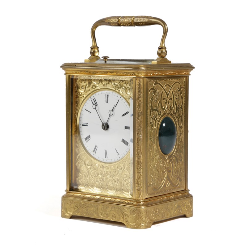 the brass eight day repeating movement with a platform lever escapement strikin gon a bell, the backplate stamped '2377', the circular white enamle dial with Roman numerals, the scroll and leaf engraved corniche case with agate cabochons to each side, the back door with shuttered winding holes