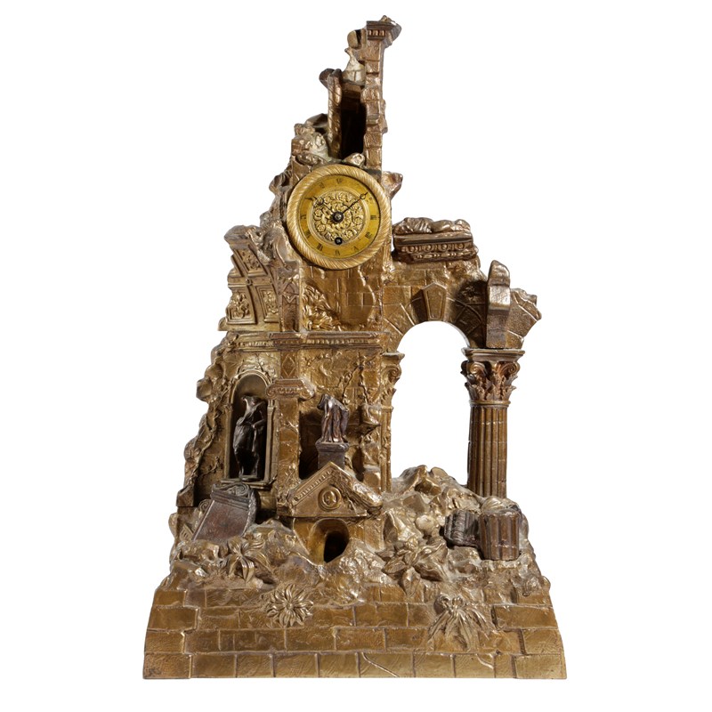 A FRENCH BRONZE NOVELTY GRAND TOUR CLASSICAL RUINS MANTEL CLOCK