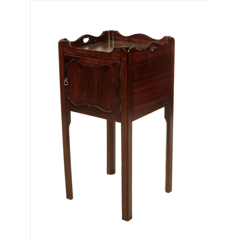 A mahogany bedside cupboard, with a wavy edge gallery pierced with two handgrips, 29½in (75cm) high, 14½in (36.3cm) wide, 14¼in (36.1cm) deep.