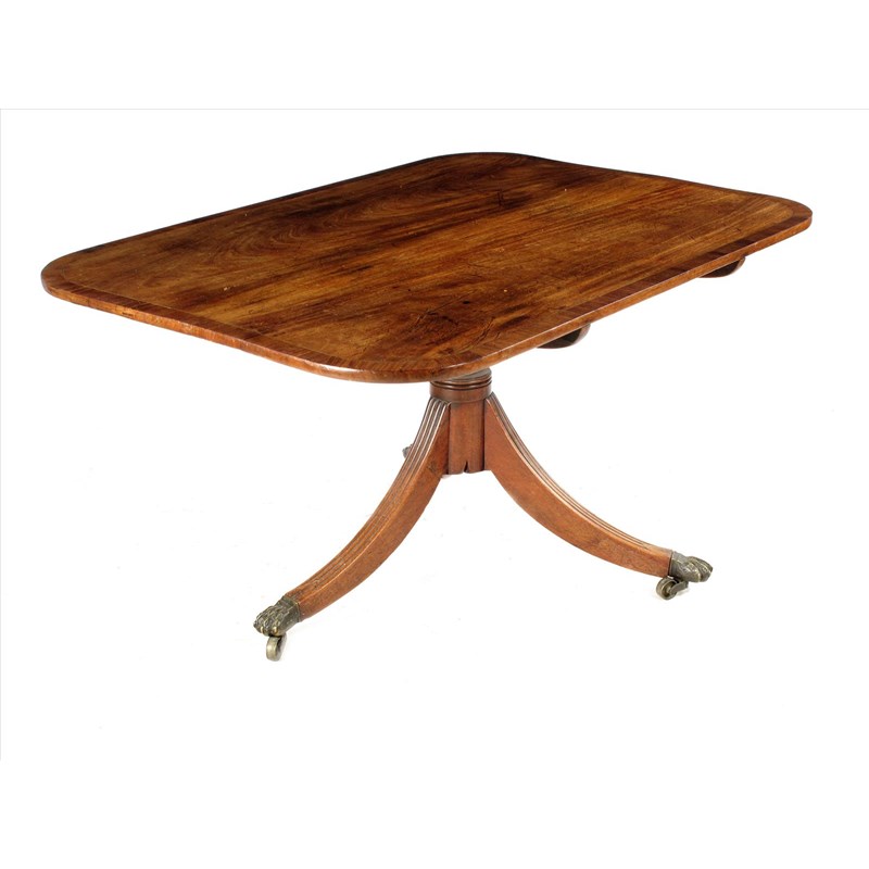 A mahogany breakfast table, the crossbanded tilt-top inlaid stringing, on a turned stem and stiff leaf carved ribbed legs to brass paw caps and castors, George III top and base possibly associated, 28¼in (71.4cm) high, 52½in (133cm) wide, 37¼in (94.7cm) deep.