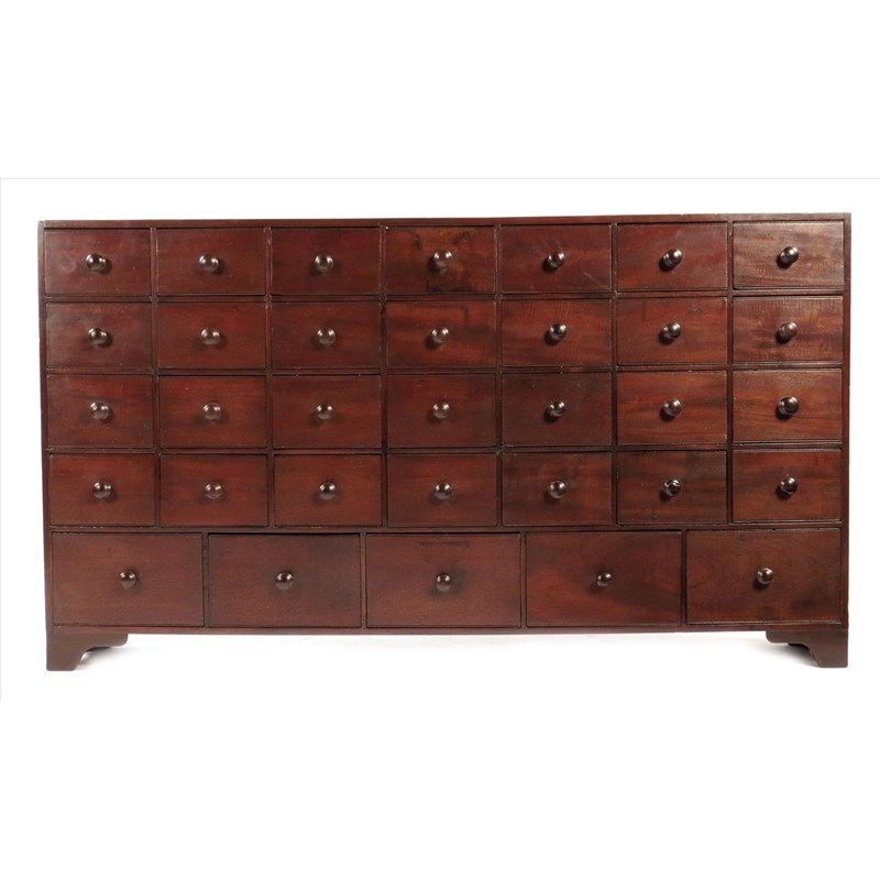 A 19th century mahogany and pine bank of thirty-three drawers, on later bracket feet, 33¾in (85.7cm) high, 60in (152.1cm) wide, 8¾in (21.8cm) deep.