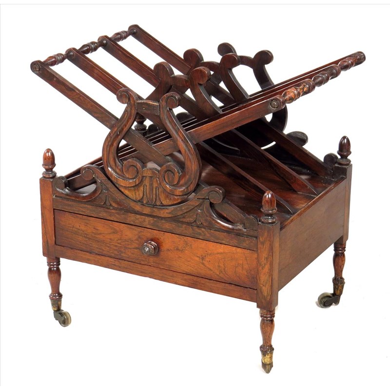 λA William IV rosewood Canterbury, with four 'X' shaped divisions, carved with lyre ends and acorn finials, 20in (51cm) high, 19½in (49.2cm) wide, 14¼in (36cm) deep.
