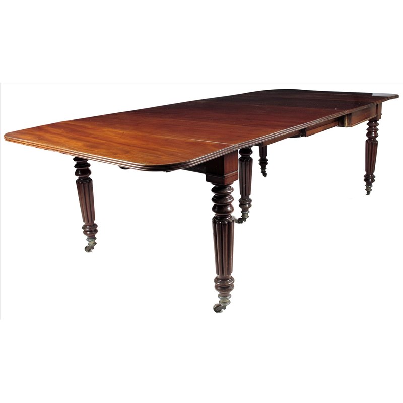 A George IV mahogany extending dining table, the reeded edge top with drop-leaf ends and two additional leaves on a telescopic frame on ribbed legs with a central support and brass castors, 29in (73.3cm) high, 98in (249.1cm) extended, 44in (111.3cm) deep.