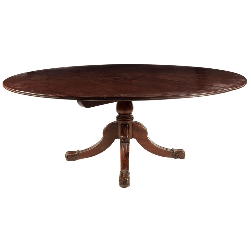 A mahogany centre table, the circular tilt-top with a reeded edge on a baluster stem and lappet scroll legs, with palmette and scroll carved feet with sunken brass castors, 29in (73.6cm) high, 72in (183cm) diameter.