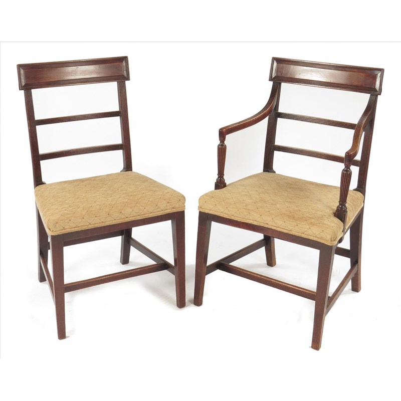 A set of eight early 19th century mahogany dining chairs, with later stuffed-over seats, comprising: a pair of open armchairs and six side, one side chair later. (8)