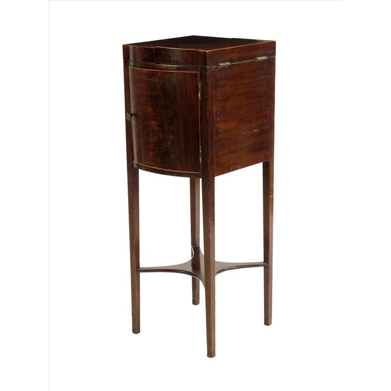 A 19th century mahogany washstand, with a twin hinged top, with three apertures, 34¾in (87.8cm) high, 12¼in (30.9cm) wide, 13¼in (33.8cm) deep.