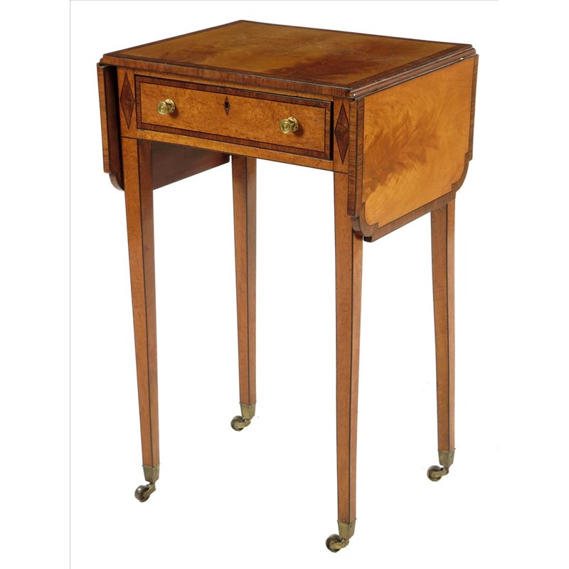 λA Regency satinwood, amboyna and rosewood occasional table, with ebonised stringing, the breakfront drop-leaf top above an amboyna veneered base with a frieze drawer, on brass caps and castors, 28in (71.cm) high, 17¼in (43.6cm) wide, 14in (35.7cm) deep.