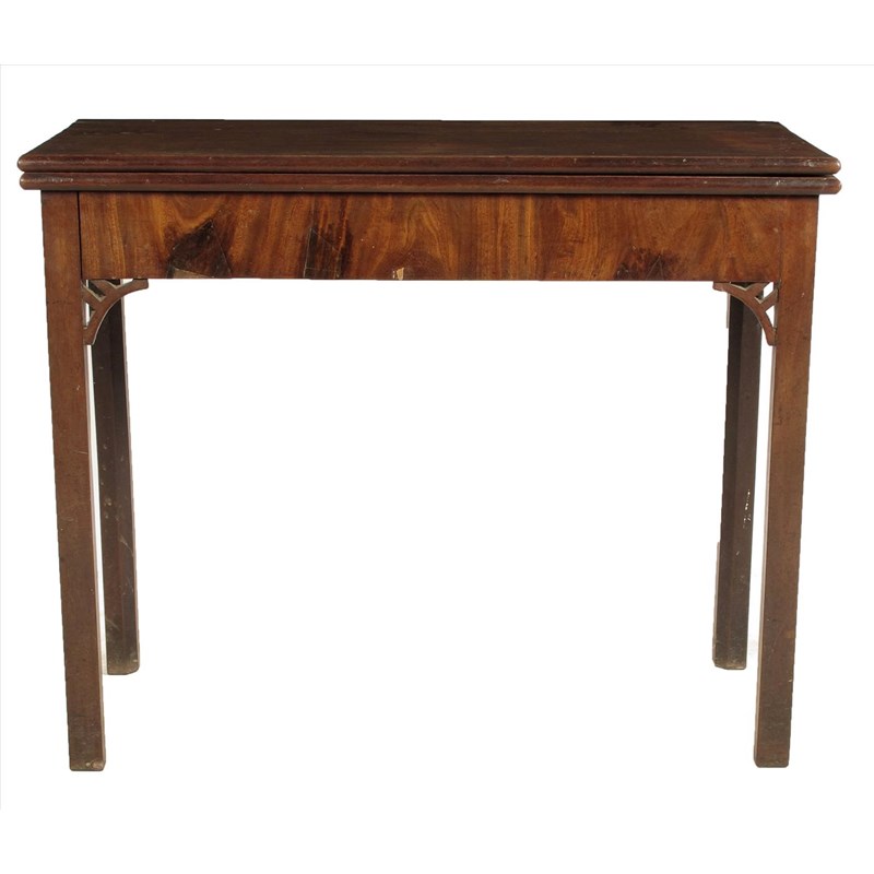 A George III mahogany tea table, with fret brackets on square chamfered legs, 29in (73.5cm) high, 36in (91.2cm) wide, 17½in (44.4cm) deep.