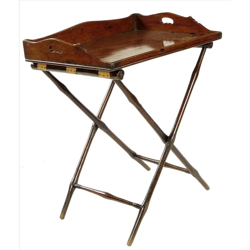 An early 19th century mahogany butler's tray, with a shaped gallery and pierced handgrips, on an associated folding stand, 31½in (80cm) high, 26in (66cm) wide, 19¼in (48.8cm) deep.