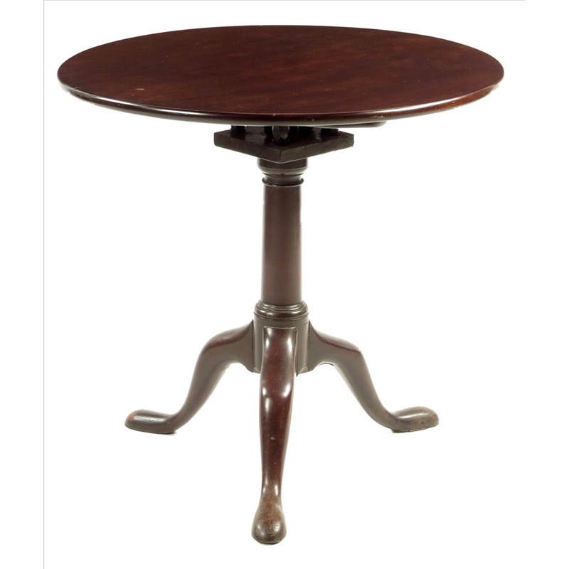 A mid 18th century mahogany tripod table, the circular tilt-top revolving on a bird cage, 25½in (64.6cm) high, 26in (66cm) diameter.