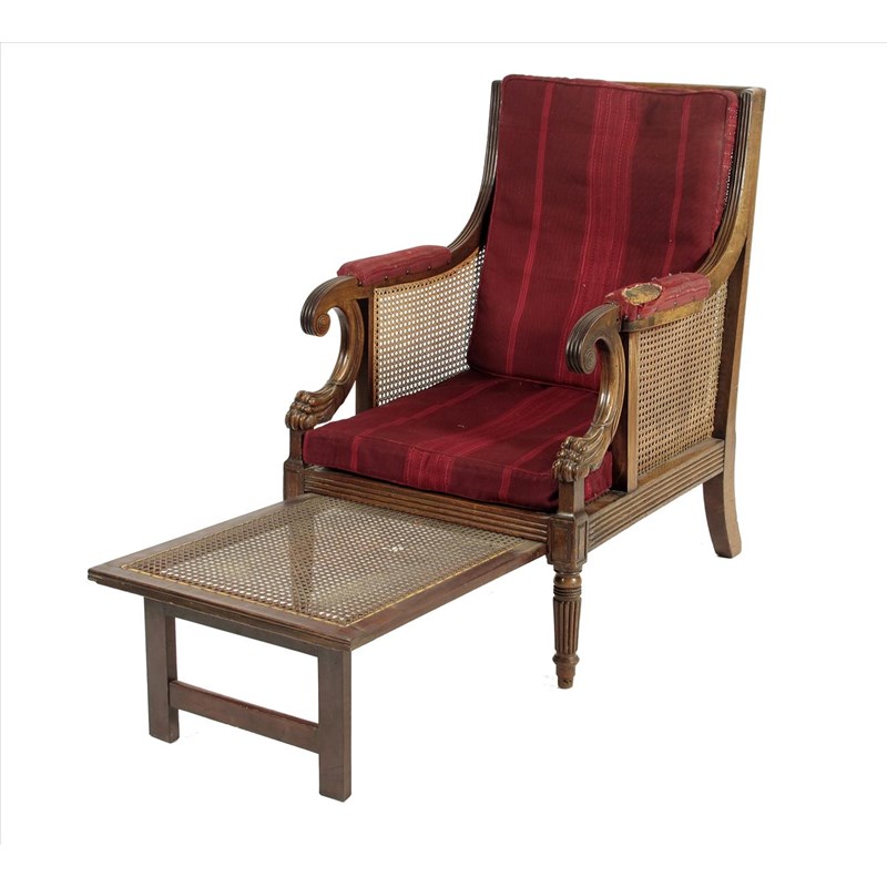 A George IV mahogany bergère, with carved paw and lappet scroll arms to a pull-out footrest on reeded front legs, originally on castors.