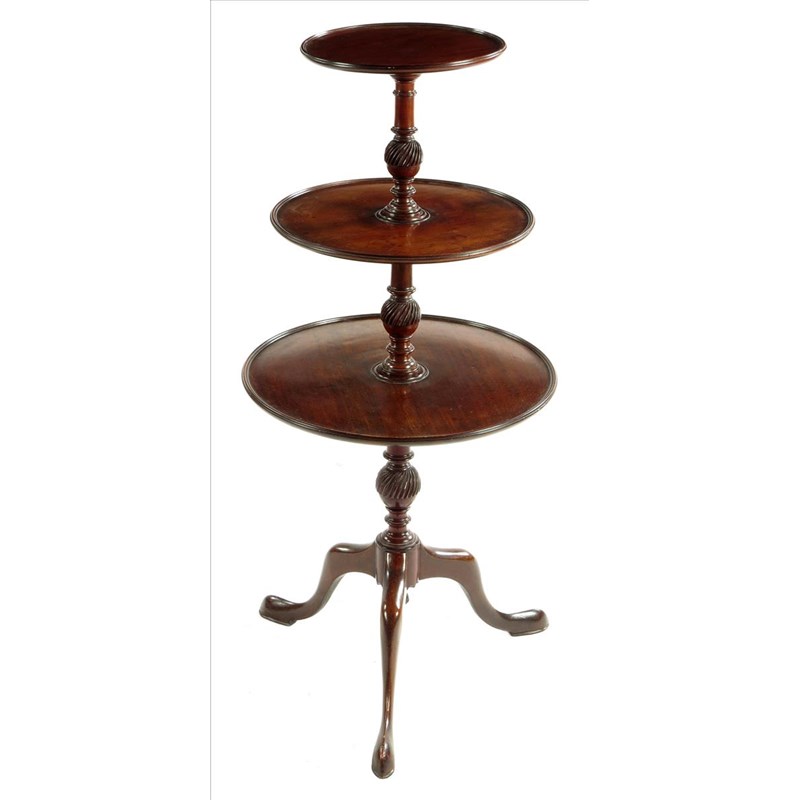 A mahogany dumb waiter, with three graduated dished tiers, two revolving, on tripod supports, 42¼in (107.2cm) high, 20½in (52cm) wide.
